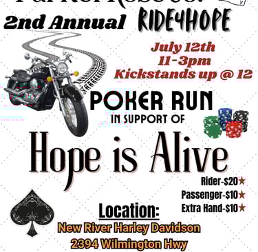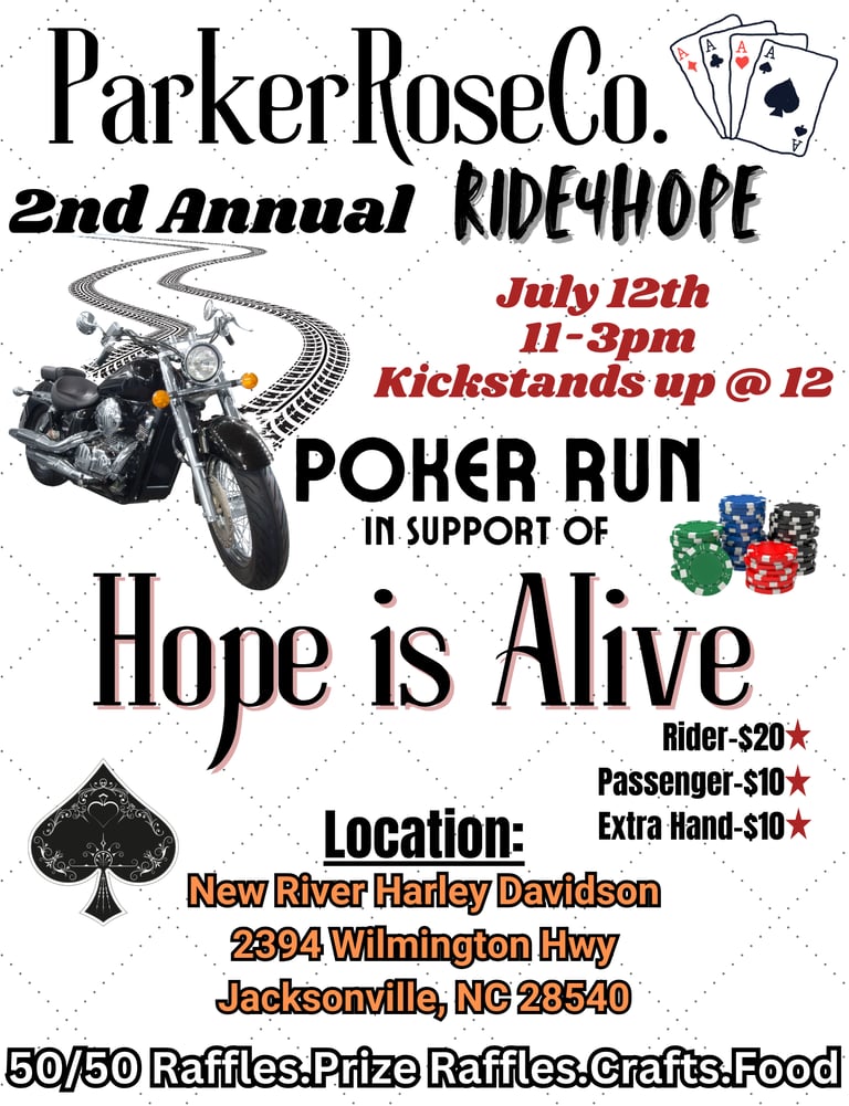 Join us in supporting ParkerRoseCo. in their 2nd annual “Ride4Hope” poker run! This exciting event not only brings the community together but also raises vital funds for Hope is Alive, a remarkable organization dedicated to addressing substance abuse issues. By participating in the ride, you can enjoy a thrilling day on the road while making a meaningful impact in the lives of those affected by addiction. Every mile ridden and every poker hand played contributes to the hope and healing of individuals on their journey toward recovery. Let’s come together to ride for a cause, spread awareness, and show that hope truly is alive! We look forward to seeing you there for a day filled with camaraderie, support, and purpose. Don’t miss out on being part of this inspiring event!