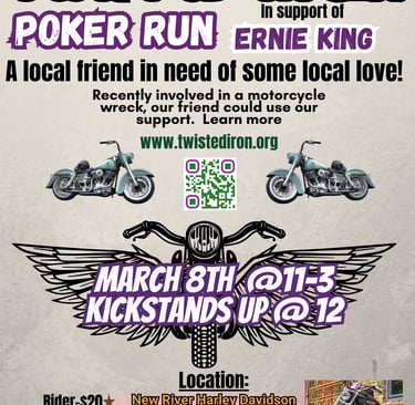 Ernie King, a beloved local pastor, deputy, and trusted confidant, recently suffered injuries from a motorcycle accident that will keep him from work for some time. Known throughout the community, Ernie is the sole provider for his family of four, and his current situation has brought challenges that they must face together. In light of this, it's crucial that we come together as a community to support him and his loved ones. Let’s organize a gathering filled with fun and camaraderie, where we can raise blessings and provide the help needed during this difficult time. Your participation and generosity can make a significant difference for Ernie and his family as they navigate this unexpected hardship.